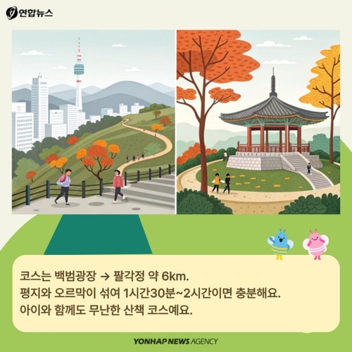 코스는 백범광장 → 팔각정 약 6km. 평지와 오르막이 섞여 1시간30분~2시간이면 충분해요. 아이와 함께도 무난한 산책 코스예요.