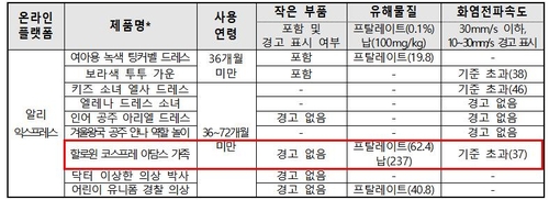 한국소비자원은 중국계 쇼핑 직구 플랫폼 알리익스프레스와 테무에서 판매하는 어린이용 드레스·코스튬 각각 10종과 7종의 안전성을 조사한 결과 52.9%(9종)이 안전기준에 부적합한 것으로 확인됐다고 24일 밝혔다.