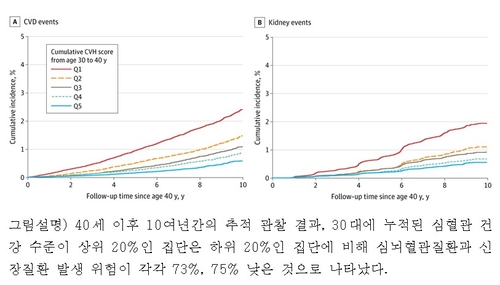 젊은 시절부터 심혈관 건강 관리에 힘쓰면 실제로 중년기 심뇌혈관질환과 신장질환 발생 위험을 70% 이상 낮출 수 있다는 연구 결과가 나왔다.