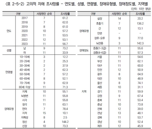 장애인 중에서도 남성의 자살 조사망률(73.2명)이 특히 높았다. 여성 장애인의 자살 조사망률은 33.9명이었다.
