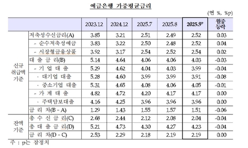 김민수 한은 금융통계팀장은 "지표금리인 은행채 금리는 9월 중 올랐지만, 일부 은행이 8∼9월 가산금리를 낮추고 우대금리를 확대하면서 전세자금대출과 신용대출의 금리가 떨어졌다"며 "전체 가계대출 금리의 경우 금리 수준이 상대적으로 높은 일반 신용대출의 비중이 커지면서 전월 수준을 유지했다"고 설명했다.