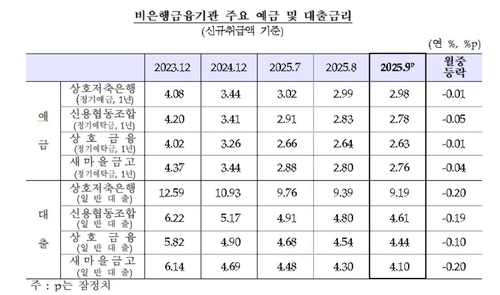 대출금리 역시 상호저축은행(9.19%·-0.20%p), 신용협동조합(4.61%·-0.19%p), 상호금융(4.44%·-0.10%p), 새마을금고(4.10%·-0.20%p)에서 모두 떨어졌다.
