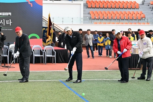 (서울=연합뉴스) 오세훈 서울시장이 31일 오전 용산구 효창운동장에서 열린 '제25회 시니어올림픽'에서 그라운드 시타를 하고 있다. 2025.10.31 [서울시 제공. 재판매 및 DB 금지]