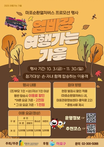 (서울=연합뉴스) 정준영 기자 = 마포구(구청장 박강수)는 마포구시설관리공단이 주최·주관하는 마포순환열차버스 프로모션 행사 '엄빠랑 여행가는 가을'이 오는 30일까지 운영된다고 6일 밝혔다.