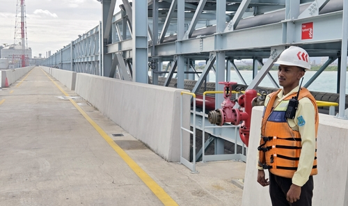박찬욱 롯데케미칼 인도네시아 법인 기술팀 책임은 "선박에서 하역한 납사는 바다에 떠 있는 제티에서 육지에 있는 원료 탱크까지 수송관(파이프라인)을 통해 옮겨진다"고 설명했다.