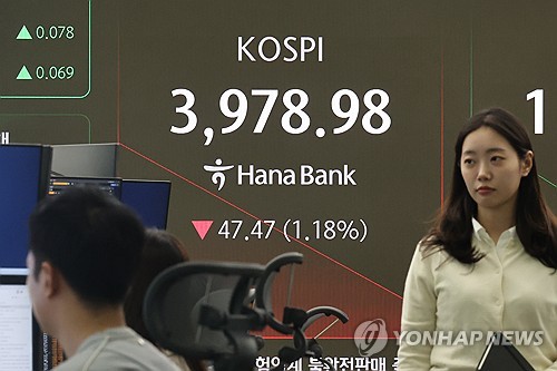 이날 오전 11시 현재 코스피는 전장보다 58.11포인트(1.44%) 내린 3,968.34다.