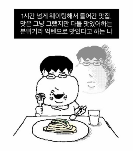 '도대체 얼마나 맛있길래'라는 생각으로 기다린 끝에 들어선 식당이 기대에 못 미치는 경우에도 일행의 기분을 망치지 않기 위해 억지로 분위기를 맞춰야 하는 순간을 겉모습과 속마음으로 나눠 표현했다.
