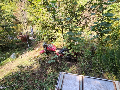 길을 따라 조금 더 내려가자 버려진 움막과 심하게 녹슨 오토바이도 풀숲서 덩그러니 발견됐다.