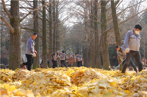 가로변에서 모은 은행잎을 정성스럽게 선별해 남이섬으로 보내고, 남이섬 중앙에 늘어선 100m가량 길에 뿌려 송파은행나무길을 만든다.