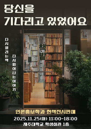 (제주=연합뉴스) 제주대학교 언론홍보학과는 출판문화론 강의의 하나로 오는 25일 오전 11시부터 오후 6시까지 학생회관 1층에서 17번째 헌책 전시·판매 행사 '당신을 기다리고 있어요'를 개최한다.