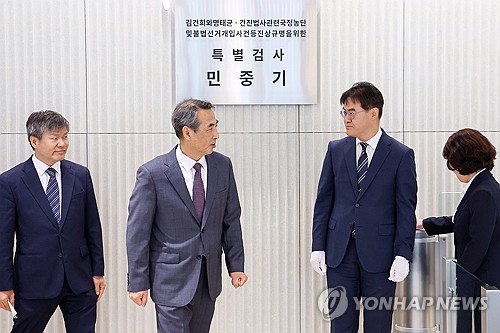 (서울=연합뉴스) 서대연 기자 = 윤석열 전 대통령 부인 김건희 여사와 관련한 각종 의혹 사건을 수사하는 민중기 특별검사가 2일 서울 종로구 KT광화문빌딩에 마련된 사무실 앞에서 현판 제막을 마치고 자리를 떠나고 있다. 2025.7.2 [공동취재] dwise@yna.co.kr