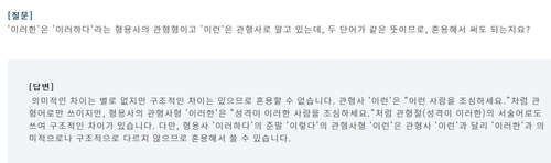 [이러한]은 상태, 모양, 성질 따위가 이와 같다는 뜻의 형용사 '이러하다'의 관형사형이다. 각각 이런, 이렇다로 줄일 수 있다. 앞에 억지춘향이와 관련된 상태, 모양, 성질 따위의 맥락이 분명하게 있다면 그것과 연결하여 '이러한 억지춘향이'로 쓰는 게 나을 수 있다. <억지춘향이는 거짓말을 잘한다. 이러한 억지춘향이의 주장은 설득력이 약하다.> 하는 식이다. 이러한은 거짓말을 잘한다는 억지춘향이의 특징을 대신하는 말 아닌가. 그러나 다른 많은 경우 그러한 태도, 그런 의견, 이러한 자세, 이런 정신력으로 쓰는 게 자연스럽다. 뒤집어 반복한다. 수식어가 피수식어와 멀리 떨어져 있으면 그것이 꾸미는 말이 뭔지 찾기 어려워진다. 수식어를 어디에 두느냐에 따라 뜻이 달라지기도 한다는 점, 그것은 두려운 일이기도 하다. (서울=연합뉴스, 고형규 기자, uni@yna.co.kr)