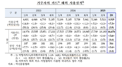 비거주자의 3분기 카드 국내 사용액은 37억6천만달러(약 5조5천374억달러)로 역대 최대였던 2분기(37억9천만달러)보다 0.8% 줄었다.
