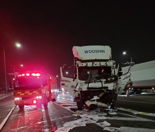 (부천=연합뉴스) 황정환 기자 = 26일 오전 0시 45분께 경기 부천시 소사구 수도권 제1순환고속도로 송내IC 인근에서 7.5t 화물차가 정차 중인 4.5t 화물차, 공사 작업 차량과 연쇄 추돌하는 사고가 발생했다.