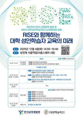 (서울=연합뉴스) 오보람 기자 = 한국교육개발원(KEDI)은 대학성인학습자연구교류협의회(회장 강대중)와 함께 다음 달 4일 상연재 서울역점에서 'RISE 성인학습자 교육, 어디로 어떻게 나아갈 것인가'를 주제로 포럼을 연다고 26일 밝혔다.