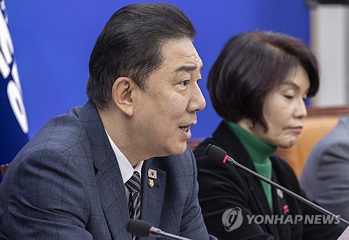 (서울=연합뉴스) 황광모 기자 = 더불어민주당 김병기 원내대표가 27일 국회에서 열린 원내정책회의에서 홈플러스 매각 무산과 관련한 발언을 하고 있다. hkmpooh@yna.co.kr