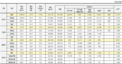 실제로 지난해 기준 선임급 연구직 연구수당은 평균 1천722만원, 선임급 행정원 연개능은 1천955만원으로 나타났고, 원급에서도 각각 1천458만원, 1천725만원으로 차이가 났다.