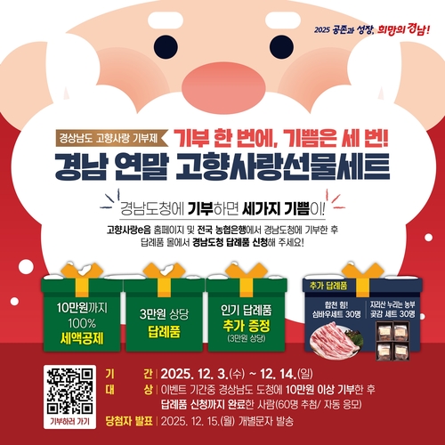 (창원=연합뉴스) 이정훈 기자 = 경남도는 오는 3일부터 세액공제와 기본 답례품 외에 인기 답례품을 추가로 증정하는 고향사랑기부제 감사 이벤트를 시작한다고 2일 밝혔다.