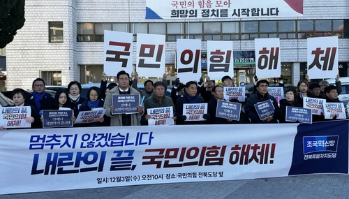 조국혁신당 전북도당도 이날 국민의힘 전북도당 앞에서 기자회견을 열고 "국민 앞에 사죄할 마지막 기회마저 스스로 걷어찬 정당은 대한민국 정치에 설 자리가 없다"며 "민주주의를 좀먹는 헌정 파괴의 숙주, 국민의힘은 이 땅에서 퇴장해야 한다"고 비판의 수위를 높였다.