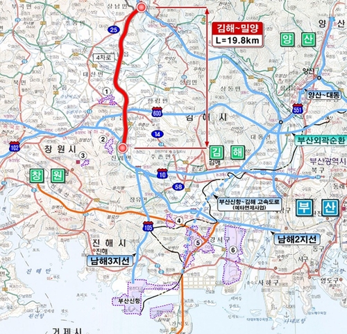 정부가 1조6천억원을 투입해 2030년대 중반 개통을 목표로 하는 김해∼밀양 고속도로는 김해시 진례면∼밀양시 상남면(19.8㎞)을 연결한다.