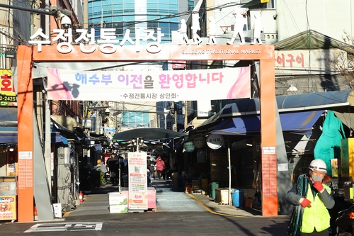 임시청사 바로 옆 수정전통시장 입구에는 상인회 이름으로 '해수부 이전을 환영합니다'라는 현수막이 붙었다.