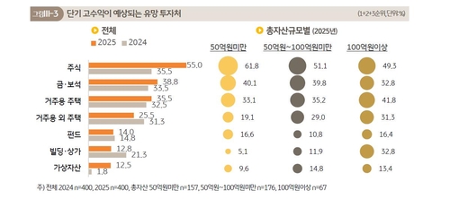 2024년 같은 조사 결과와 비교해 유동성 금융자산과 예·적금, 주식의 비중이 각 0.4%포인트(p), 1.0%p, 0.5%p 늘었다. 반대로 거주용 주택, 거주용 외 주택, 빌딩·상가는 각 1.0%p, 0.5%p, 1.6%p 줄었다. 부동산 시장 관망세와 부동산 신규 투자 위축 때문이라는 게 연구소의 설명이다.