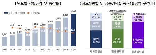 국가데이터처(옛 통계청)가 15일 발표한 '2024년 퇴직연금통계'를 보면 작년 퇴직연금 총적립금액은 431조원으로 1년 전보다 12.9% 증가한 것으로 집계됐다.