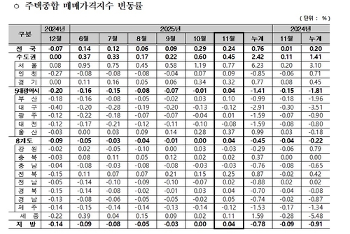 전국 주택종합 매매가격은 0.24% 올라 전월 대비 상승폭이 0.05%포인트 축소됐다.