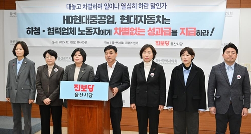 진보당 울산시당도 이날 울산시의회에서 기자회견을 열어 "HD현대중공업과 현대자동차는 협력업체 노동자에게 차별 없는 성과급을 지급하라"라고 요구했다.