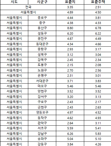 시도별 표준지 공시가 상승 폭은 서울(4.89%), 경기(2.67%), 부산(1.92%), 대전(1.85%), 충북(1.81%), 세종(1.79%) 등 순으로 컸다.