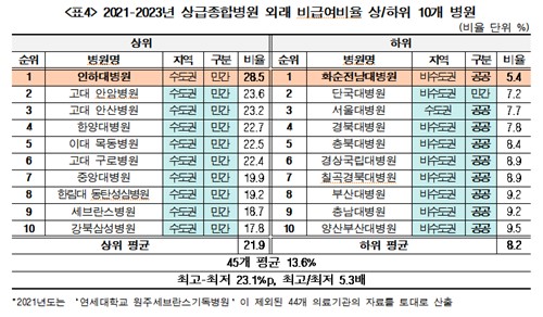 경제정의실천시민연합(경실련)은 상급종합병원 45곳(공공병원 12곳)이 보건복지부에 신고한 2021∼2023년 회계 자료를 바탕으로 건강보험 환자의 비급여 비율(외래·입원)을 산출했다.