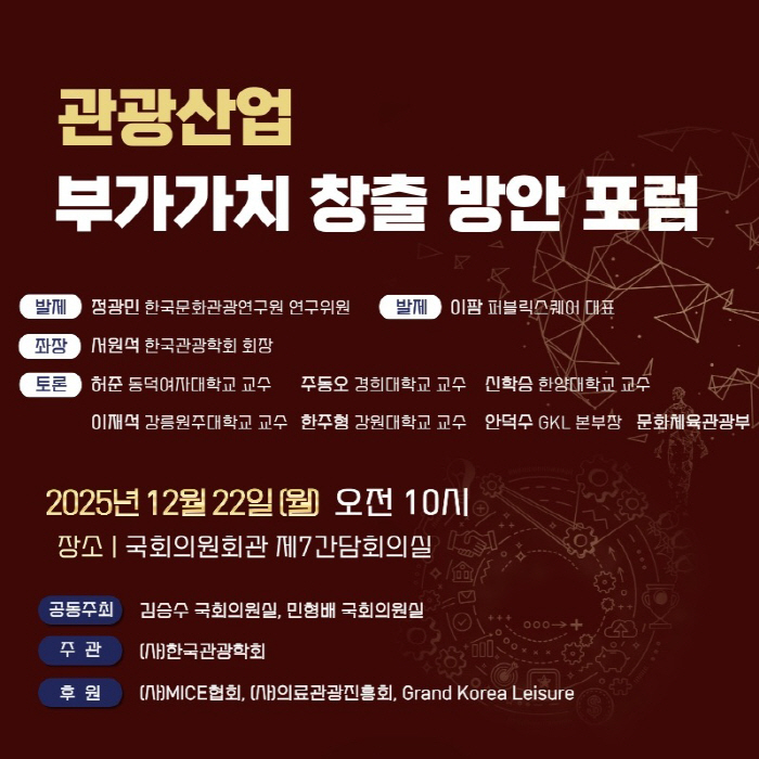 토론에는 (사)한국관광학회 서원석 회장이 좌장을 맡았다. 토론자로는 허준 동덕여대 교수, 주동오 경희대 교수, 신학승 한양대학교 교수, 이재석 국립강릉원주대 교수, 한주형 강원대 교수, 안덕수 GKL 마케팅본부장, 김나나 문화체육관광부 융합관광산업과장이 참여한다.