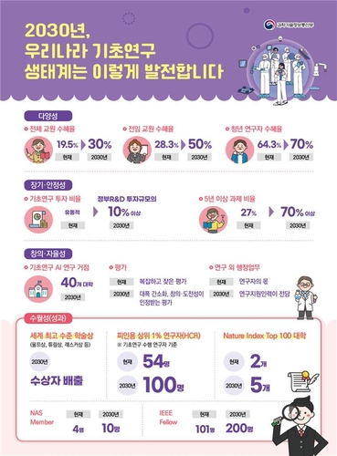 또 개인연구 기간을 1~3년에서 3~5년으로 연장해 5년 이상 과제 비율을 현행 27%에서 2030년까지 70% 이상으로 끌어올리기로 했다.