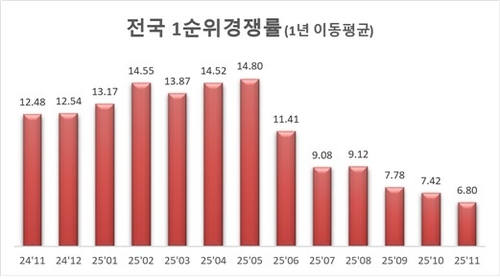 전국 평균 청약 경쟁률은 올 5월 14.80대 1로 정점을 찍은 뒤 하락 전환해 7월 9.08대 1, 8월 9.12대 1, 9월 7.78대 1, 10월 7.42대 1에 이어 11월 6.80대 1까지 5개월 연속 한 자릿수를 기록했다.