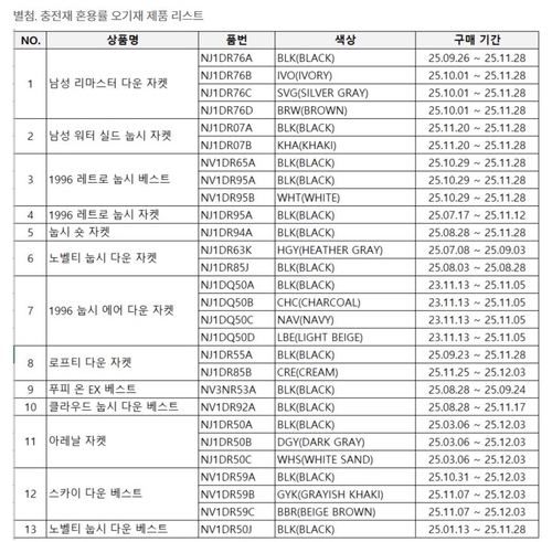 노스페이스가 공개한 리스트에 따르면 각 제품의 오기재 기간은 다양하다. '남성 워터실드 눕시 자켓'의 경우 오기재 기간이 지난달 20∼28일로 9일이지만, '1996 눕시 에어 다운 자켓'은 지난 2023년 11월 13일부터 지난달 5일까지 2년에 달한다.