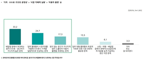 이어 '일부 플랫폼이 시장 지위를 이용해 수수료나 가격을 일방적으로 인상하는 문제'라고 답한 응답자는 24.7%, 원치 않은 광고가 지나치게 많이 노출돼 이용자 불편을 초래하는 문제를 꼽은 응답자는 17.3%였다.