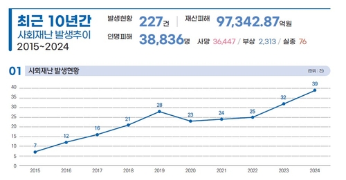 2024년 사회재난은 39건 발생해 전년(32건) 대비 약 22% 증가했다.