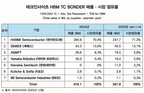 테크인사이츠는 이번 보고서에서 "TC 본더는 2025년의 단기적 정상화 과정을 거친 후, 2026년부터 다시 본격적인 반등이 예상된다"며 "2030년까지 연평균 성장률(CAGR) 약 13%의 강한 성장세를 보일 것"이라고 전망했다.