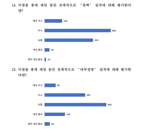 설문 대상의 53%(매우 그렇다 14%+그렇다 39%)는 이 총재가 주도한 교육·인구·노동 등 '구조개혁 논의'도 우리나라 경제정책의 방향을 찾는 데 도움이 됐다고 평가했다.