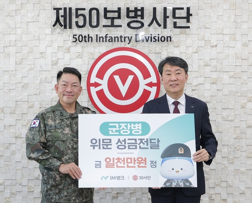 ▲ iM뱅크는 연말을 맞아 육군 제50사단에 군 장병들을 위한 위문 성금 1천만원을 전달했다고 23일 밝혔다. 이 성금은 군 장병 사기 진작과 근무 여건 개선을 위한 복지 지원에 쓰일 예정이다. (대구=연합뉴스)