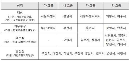국토교통부는 이날 세종시 한국교통연구원에서 시상식을 열고 최우수 5개 지자체에는 대상인 국토부 장관상을 수여할 계획이다.