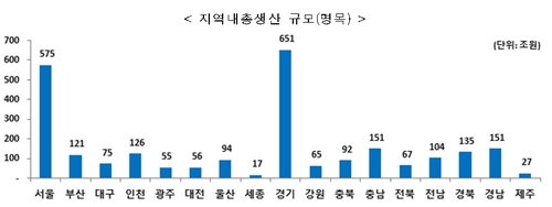 이어 경북(135조원), 인천(126조원), 부산(121조원), 전남(104조원), 울산(94조원), 충북(92조원), 대구(75조원), 전북(67조원), 강원(65조원), 대전(56조원), 광주(55조원), 제주(27조원), 세종(17조원) 순이었다.
