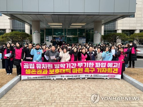 전국학교비정규직노조 대전지부는 23일 대전시교육청 앞에서 기자회견을 열고 "유치원 방과 후 과정 전담사의 처우를 개선하고 보호 대책을 마련하라"며 "노조 요구안이 수용되지 않을 경우 방학 중에도 총파업을 이어 나가겠다"고 경고했다.