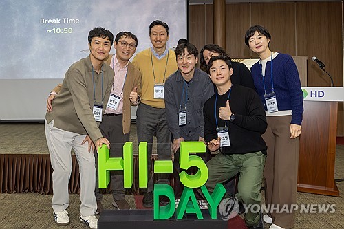 (서울=연합뉴스) 임성호 기자 = HD현대는 23일 정기선 회장이 울산 HD현대중공업 인재교육원에서 MZ 세대 직원들과 기업문화 개선 아이디어 공유회인 '하이파이브 데이'(HI-5 DAY)를 진행했다고 밝혔다.