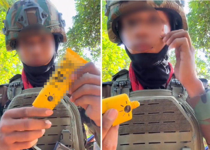 [스포츠조선 장종호 기자] 전투가 벌어지는 전장에서 선크림을 홍보하는 영상을 촬영한 캄보디아 병사의 모습이 공개돼 파문이 일고 있다.