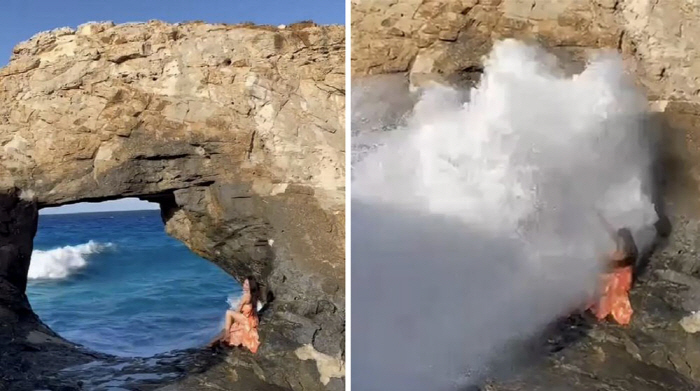 사고 당시 여성은 주황색 드레스를 입고 절벽 틈새에서 포즈를 취하고 있었다. 곧바로 갑자기 밀려온 파도가 그녀를 강하게 덮친 것이다.