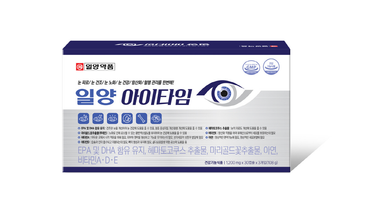 일양약품㈜의 '일양 아이타임'은 하루 한 알 섭취로 '눈 건조, 눈피로, 눈노화'를 관리할 수 있는 제품이다. 눈의 피로를 완화시키는 '아스타잔틴'과 황반색소 보충에 꼭 필요한 '루테인', 건조한 눈을 개선하는 '오메가3'를 모두 함유했다. 여기에 어두운 곳에서의 시각적응을 돕는 비타민A등을 함유한 7중 복합 기능성 프리미엄 제품이다.