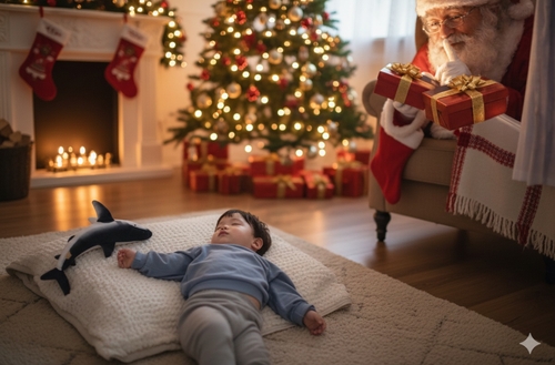 사진에는 선물을 든 산타가 한 손으로 잠든 아이의 머리를 쓰다듬는 모습이 담겼다.