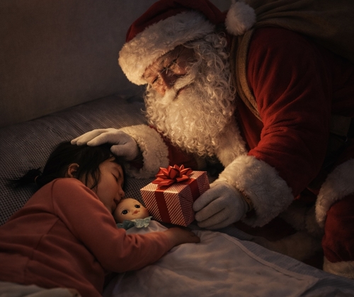 사진에는 선물을 든 산타가 한 손으로 잠든 아이의 머리를 쓰다듬는 모습이 담겼다.
