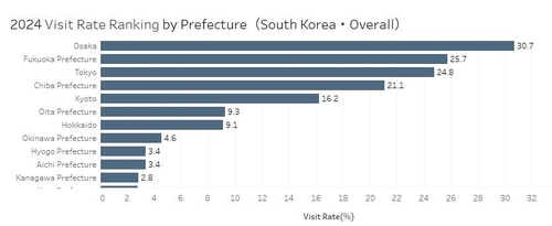 지난해 한국인이 가장 많이 방문한 일본 도시 1위는 오사카(30.7%), 2위는 후쿠오카(25.7%), 3위 도쿄(24.8%) 순이다.